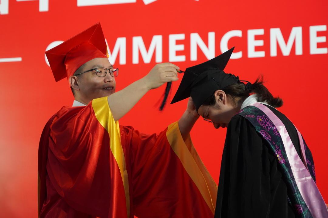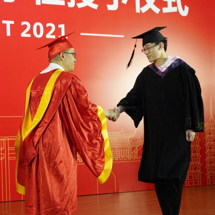 毕业典礼上,2021届全体党员毕业生向母校捐赠红船模型,祝福母校在新的起点扬帆起航、蝶变跃升。