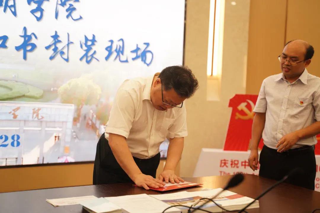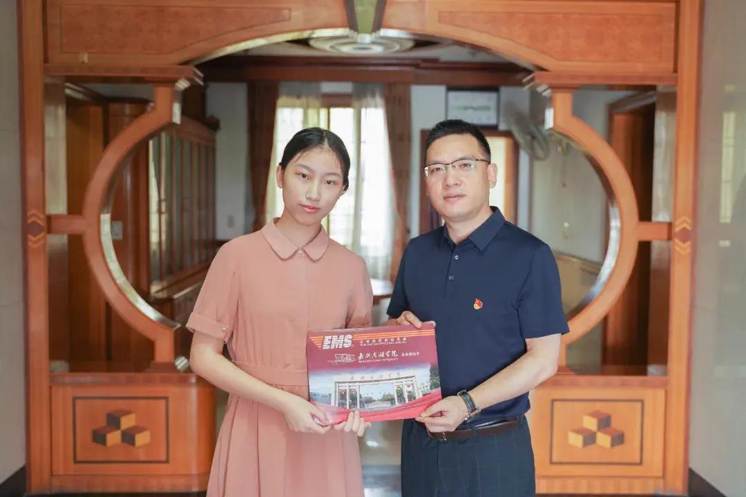 校党委副书记胡文蔚为工商管理专业的彭同学送录取通知书
